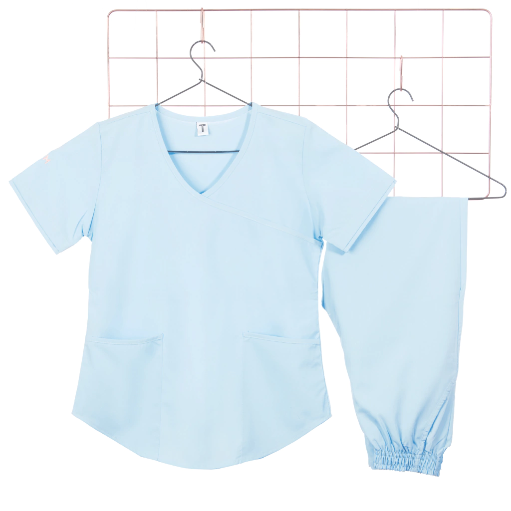 Nuestro ambo Agata Celeste es ideal para largas jornadas sintiéndote cómoda y canchera.