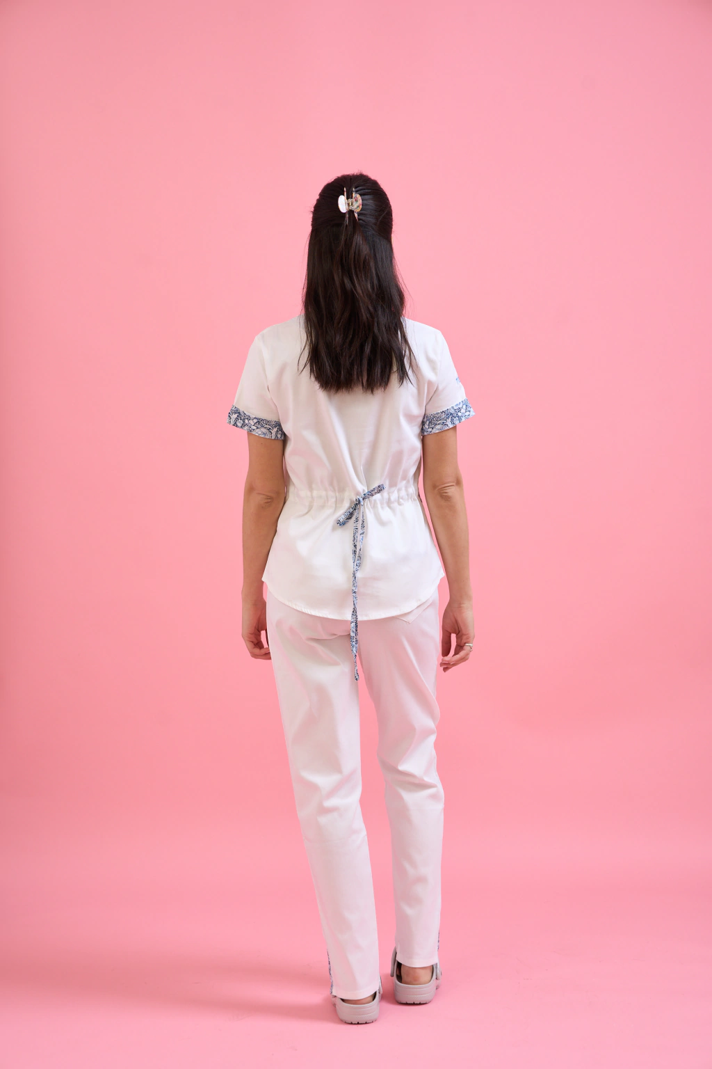 Nuestro ambo Clavel blanco es el modelo que se adapta a vos. Suave, fresco y elástico, que acompaña tu cuerpo y permite moverte con libertad todo el día.