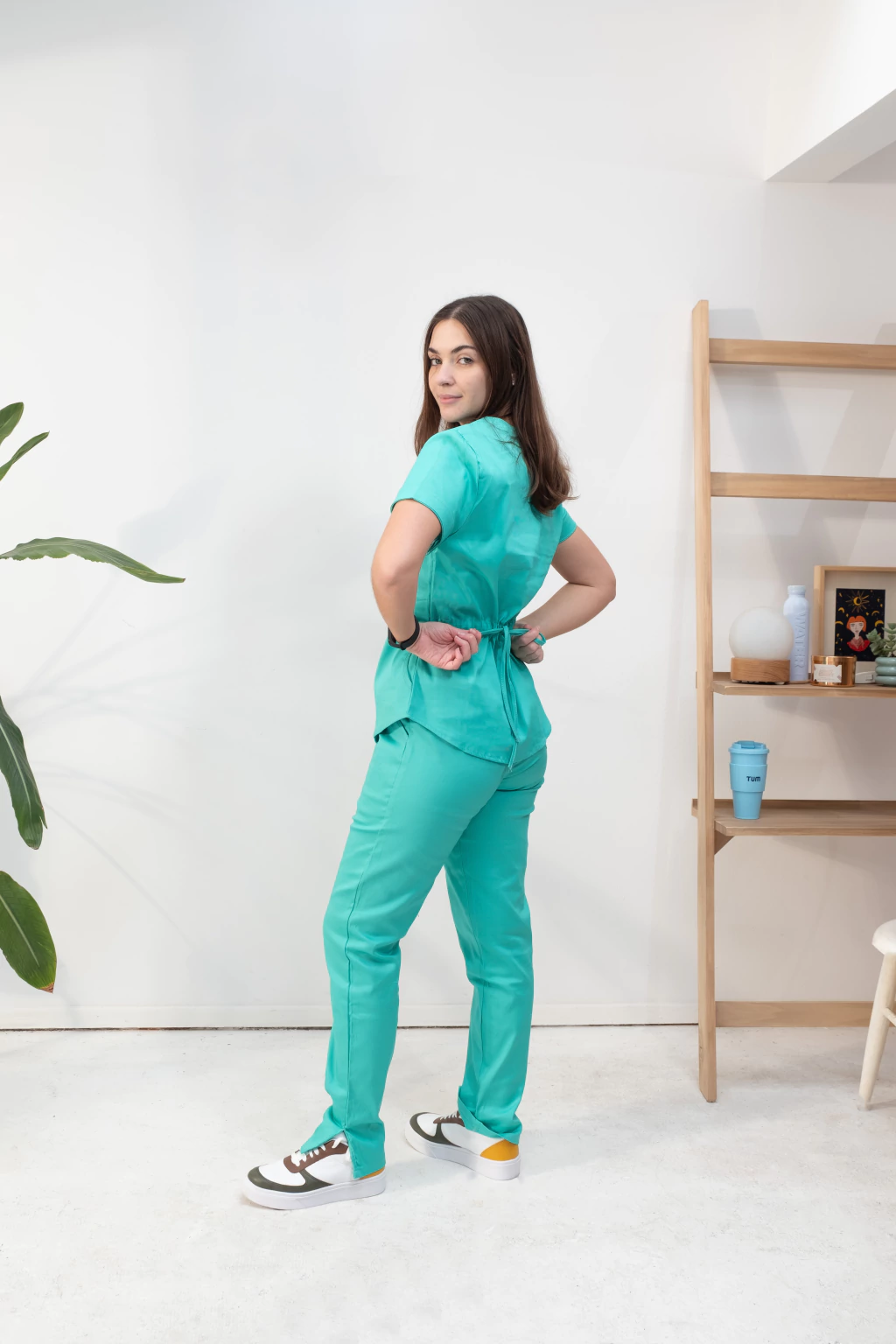 Pantalon recto con 3 bolsillos color verde quirofano con vivos a tono.