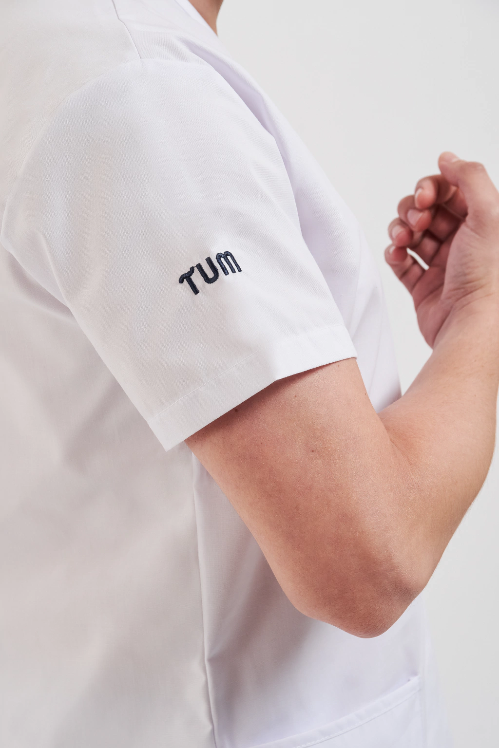 Es de corte básico, con escote V, vivos a tono, con un bolsillo en el pecho ideal para lapiceras y, dos bolsillos frontales, super amplios y cómodos para guardar el celu, llaves o lo que quieras!