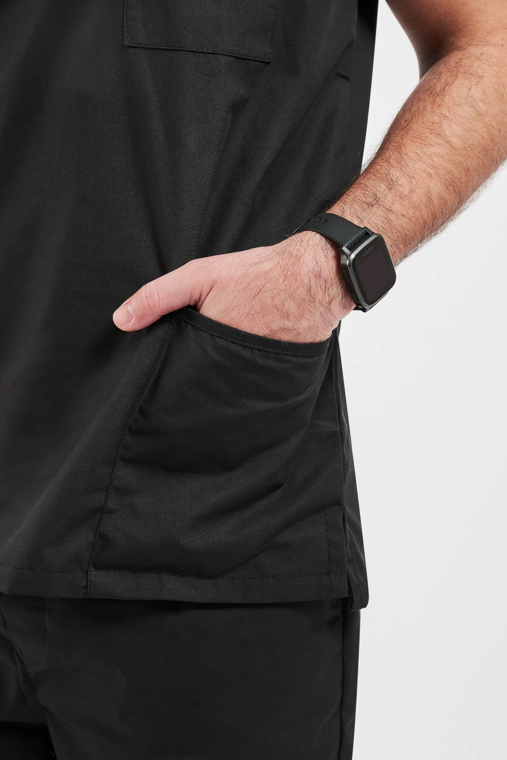 Es de corte básico, con escote V, vivos a tono, con un bolsillo en el pecho ideal para lapiceras y, dos bolsillos frontales, super amplios y cómodos para guardar el celu, llaves o lo que quieras!